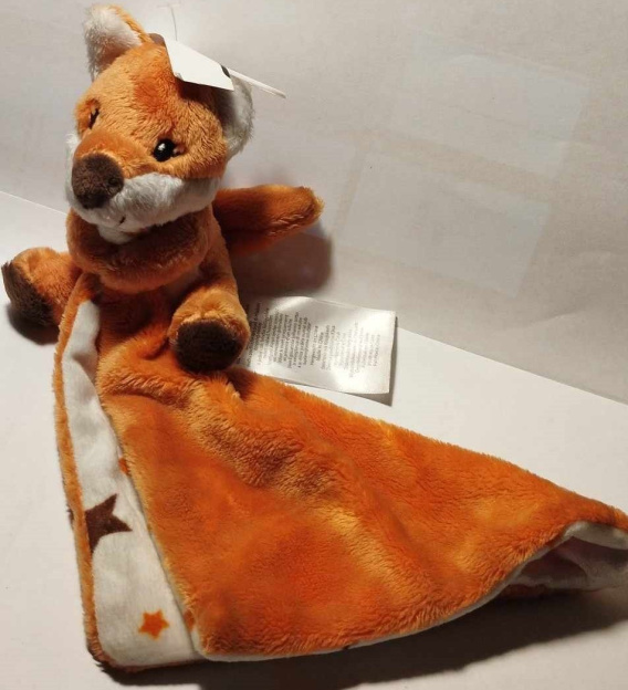 Niezwykle milutki w dotyku lisek przytulanka z kocykiem. Dziecko może używać kocyka do ssania, jako "memlaczek". Wymiary - wysokość liska 10cm, wymiary kocyka 19x19cm.