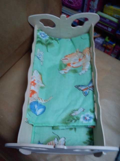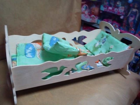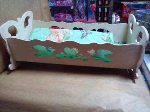 Przepiękna, rzeźbiona drewniana kołyska dla lalek z pościelą. Kołyska wykonana jest ze sklejki i jest naturalnego koloru sklejki.