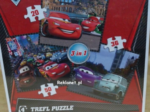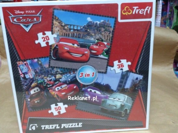 Puzzle Trefl 3 w 1 - trzy obrazki Cars 2 - 20 elem., 36 elem. i 50 elem. Wymiary obrazka po złożeniu 20 x 19,5cm). Od lat 4.