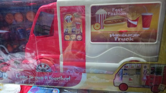 Super samochód fast food z wieloma akcesoriami do zabawy. Auto rozkłada się do zabawy, wewnątrz są szafki jak w kuchni. Podnoszona klapa - auto bar. Auto działa na baterie - światła, 3 paluszki zwykłe, nie załączone. Długość auta 35 cm. Napęd ręczny. Od lat 3