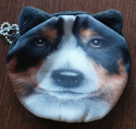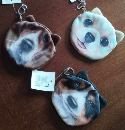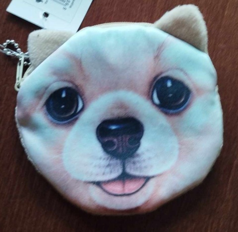 Portfelik saszetka pluszowo-materiałowa z wizerunkiem psa. Zamykana na zamek. Wymiary średnica 10cm.