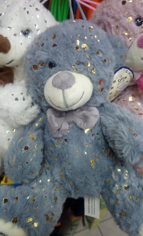 Śliczny miś ze złotymi plamkami na futerku na Walentynki i nie tylko. Wykonany z mięciutkiego, milutkiego pluszu. Idealny na zabawny walentynkowy prezent. Wysokość 22cm. B/o
