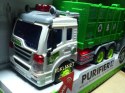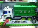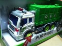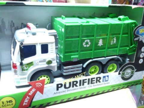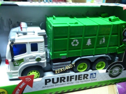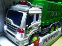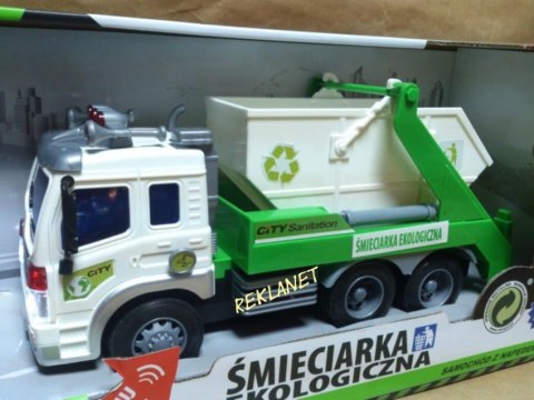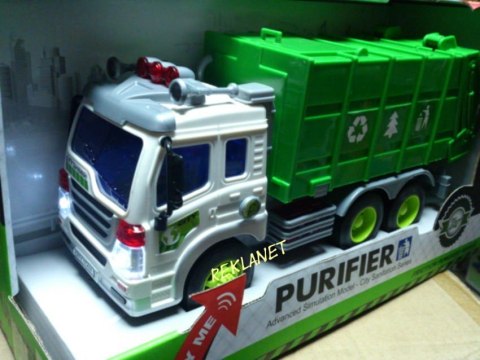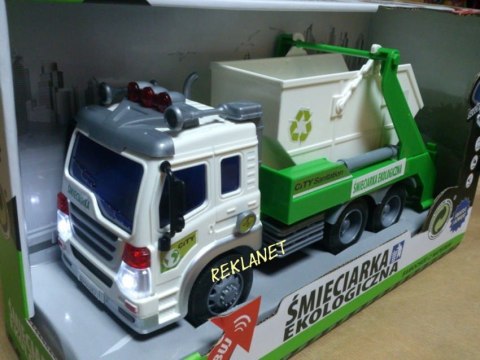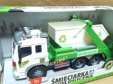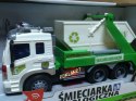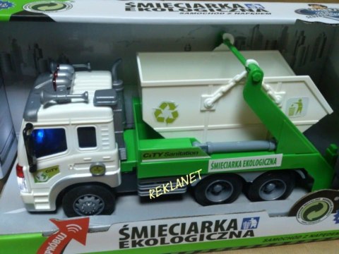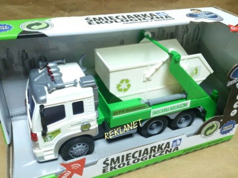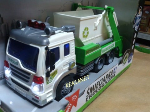 Samochód śmieciarka z ruchomym kontenerem. Zabawka plastikowa. Posiada dźwięk pracy silnika oraz migające przednie światła i podświetlany kontrolkę podnoszenia kontenera. Obsługa i napęd ręczny. Długość auta 27cm, wys. 12cm. Działa na baterie (załącz...