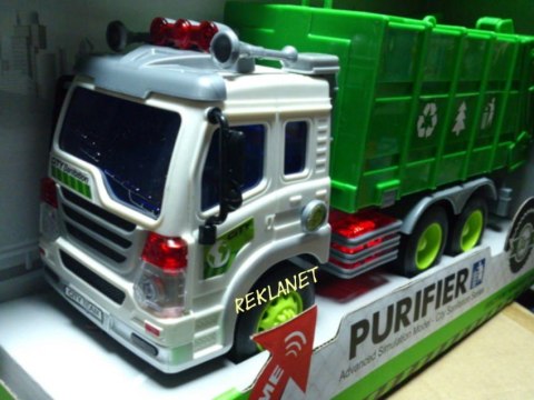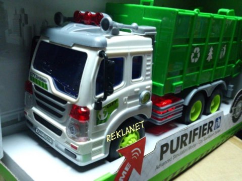 Posiada dźwięk pracy silnika oraz migające przednie światła i podświetlany kontrolkę podnoszenia kontenera.