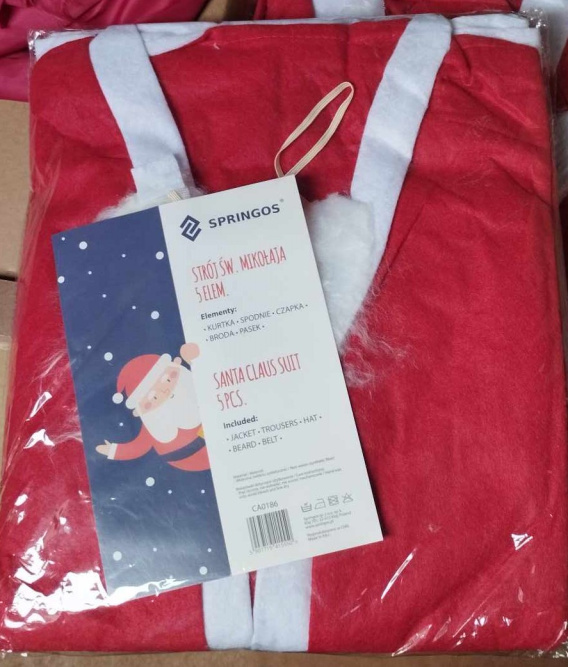 Strój św. Mikołaja - rozmiar uniwersalny. Dokładne wymiary na zdjęciu. Wykonany z flizeliny. W zestawie: Czapka Św. Mikołaja Kurtka Spodnie Broda Pasek Dokładne wymiary: Czapka Wysokość czapki z pomponem: ok 40 cm Obwód czapki: ok 60 cm Kurtka Wysokość: ok 77 cm Obwód w klatce piersiowej ok 116 cm Długość rękawa od ramienia: ok 61 cm Długość rękawa od pachy: ok 52 cm Spodnie Pas z możliwością zmniejszenia: max 106 cm, zmiana przez sznureczki wewnątrz materiału, można dopasować do każdej sylwetki Długość spodni: ok 103 cm Długość nogawki od kroku: ok 67 cm Pasek Szerokość: 3,8cm Długość: ok 120 cm B/o