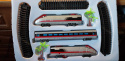 Kolejka elektryczna na baterie (2 paluszki, nie załączone) w skali 1:87. Kolejka posiada kształt pociągu Pendolino dżwięki oraz migające światła. W zestawie 2 lokomotywy, 1 wagon osobowy, 2 drzewka. Długość składu ok. 65cm, Tor można złożyć w owal o wym. 190x121cm lub okrąg o średnicy 101cm.