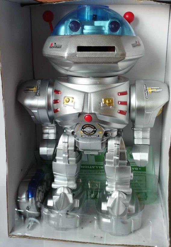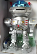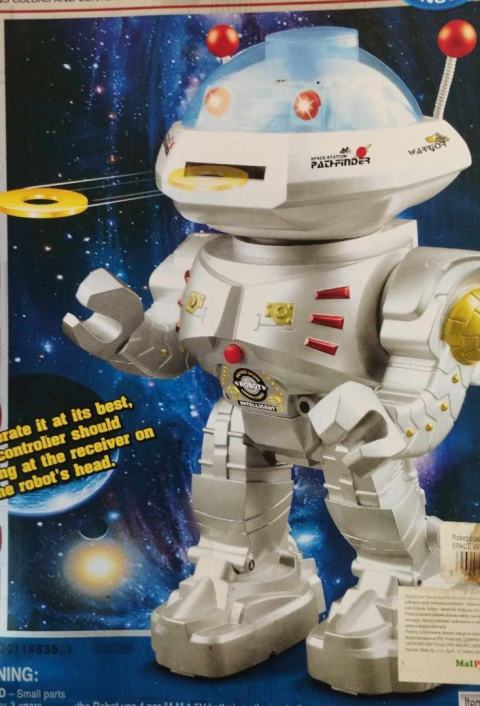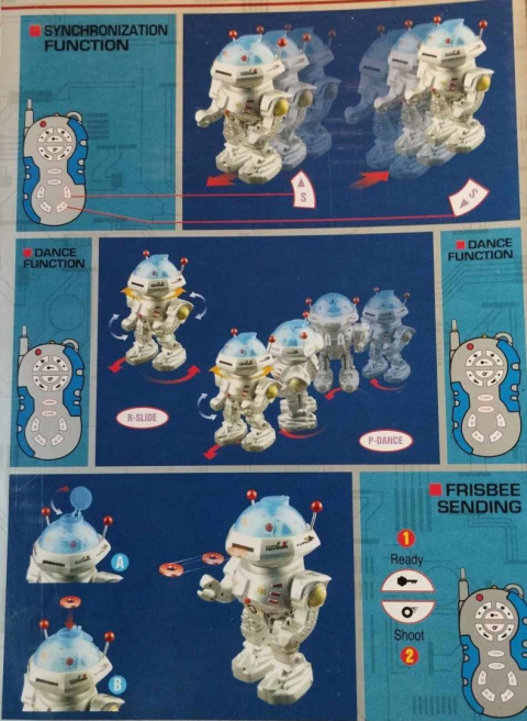 Robot chodzi, rusza rękami, obraca głową o 360`, strzela krążkami, świeci oczami. Wysokość zabawki 30cm.