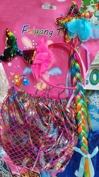 Syrenka - strój, przebranie Strój syrenki składa się z czterech elementów: spódniczki, opaski, różdżki i warkocza do dopięcia do włosów. Wszystkie elementy są w pięknych, błyszczących kolorach przez co strój jest wyjątkowy i niepowtarzalny. Spódniczka w pasie posiada gumkę - jest rozciągliwa. Rozmiar dziecięcy