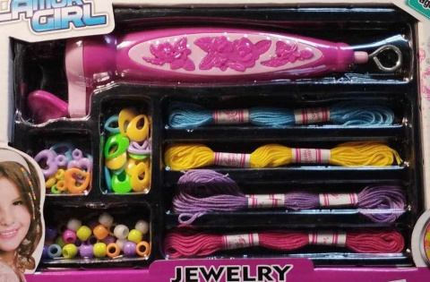 Zestaw koralików do i sznureczków do wplatania we włosy Idealny zestaw do tworzenia pięknych i niepowtarzalnych fryzur, ozdób do włosów oraz kreatywnych dodatków. Pozwala miło zająć czas i pobudzać wyobraźnię, kreatywność oraz zdolności manualne. Zestaw zawiera: - koraliki różnej wielkości i w różnych kolorach oraz kształtach - kolorowe sznurki do nawlekania koralików - maszynkę umożliwiającą zaplatanie we włosy ozdób Wiek 6+