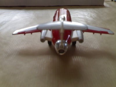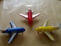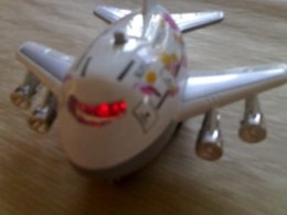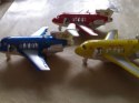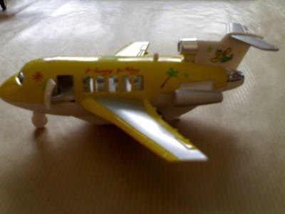 Metalowy model samolotu pasażerskiego Happy Holiday z dźwiękiem odpalanych silników oraz światłem silników i tylnym. Otwierane drzwi na pokład. Napęd ręczny.