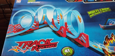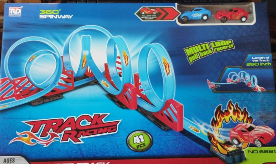 Tor samochodowy wyrzutnia 360` o łącznej długości 6,604mb. Tor zawiera wyrzutnię do wystrzelenia autka, tor w kształcie kilku pętli oraz 2 autka sportowego z napędem Pull-Back. Długość autka 7cm.