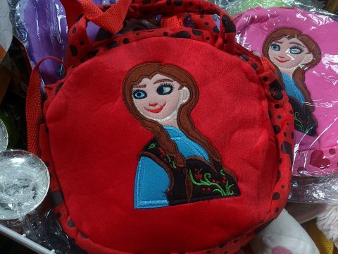Pluszowa torebka z wyhaftowanym wizerunkiem dziewczyny. Średnica torebki 25cm. Posiada pluszowe krótkie uszy do noszenia w ręce oraz pasek do noszenia na ramieniu.