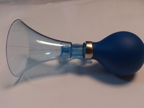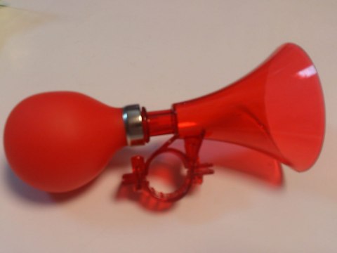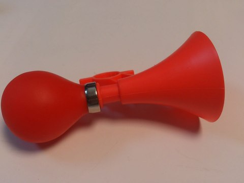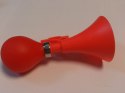 Trąbka do roweru, do przykręcenia na kierownicę, średnica objemki 22mm, długość całej trąbki 15cm. Zabawka plastikowa, średnica tuby 7cm.