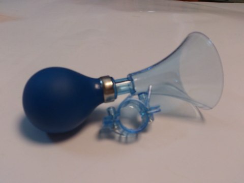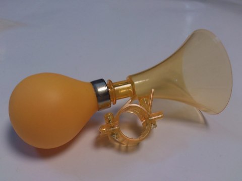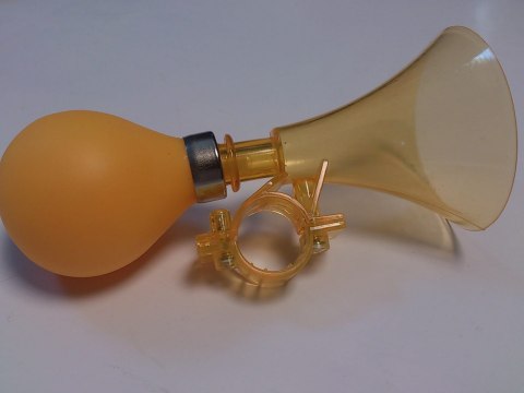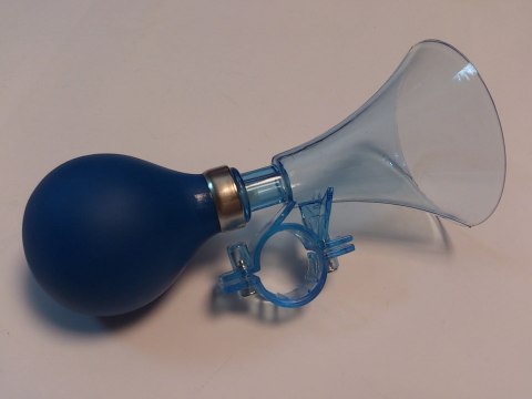 Trąbka do roweru, do przykręcenia na kierownicę, średnica objemki 22mm, długość całej trąbki 15cm. Zabawka plastikowa, średnica tuby 7cm. Dla dzieci od 3 lat.