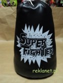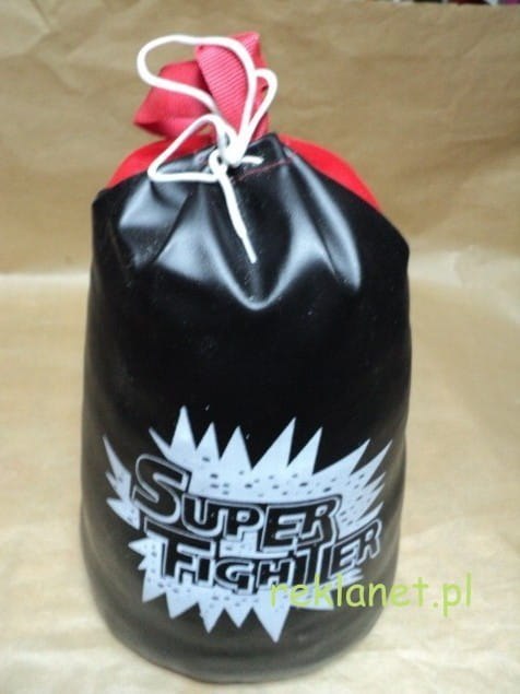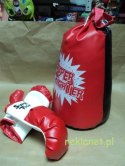 Treningowy zestaw bokserski - gruszka + rękawice. Długość gruszki 35cm. Średnica u dołu 23cm, u góry 16cm. Długość rękawicy 25cm, szer. 11cm. Od lat 3.
