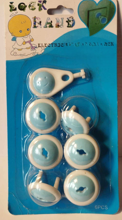 Komplet 6 zatyczek do gniazdek elektrycznych z kluczykiem do wyjmowania. Zabezpiecza dzieci przez niepożądanym wkładaniem paluszków lub przedmiotów do kontaktów.