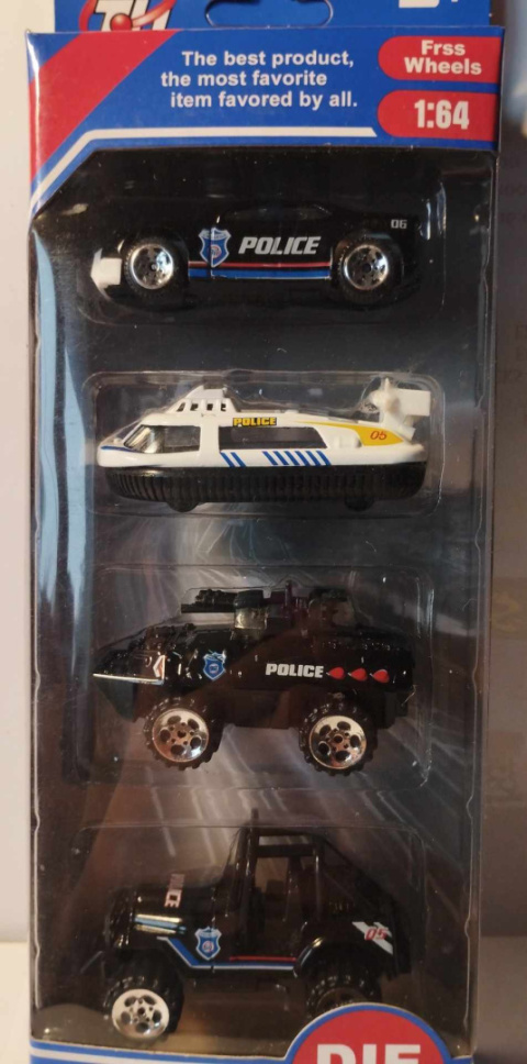 Zestaw 4 modeli metalowo-plastikowych w skali 1:64. Modele w barwach policji amerykańskiej - radiowóz, poduszkowiec, wóz bojowy i jeep policyjny. Długość autek 7 cm. Od lat 3