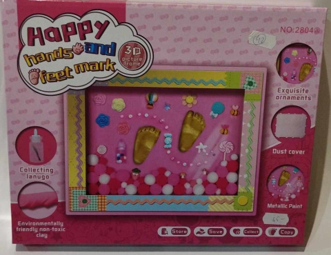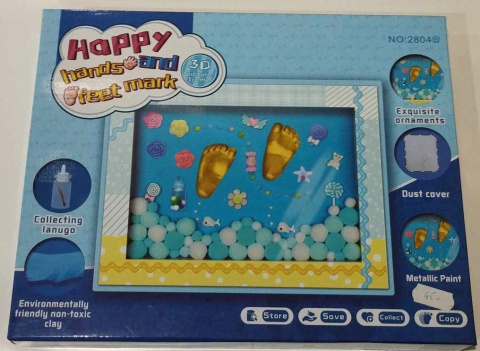 Zestaw do wykonania odcisku stópek lub rączek dziecka. Świetny na pamiątkowy prezent z okazji narodzi, 1-go roczku lub innych. Odcisk zachowuje się w postaci samodzielnie wykonanego obrazka 3D. Wym. opakowania 28x22,5x3,5cm.