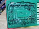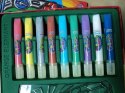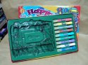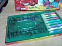 Zestaw zawiera 9 tubek farb w różnych kolorach oraz plastikową ramkę z gotowym szablonem autek.