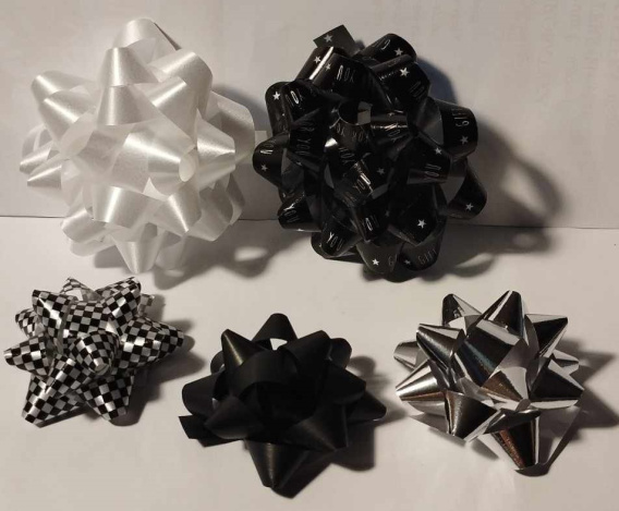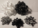 Zestaw eleganckich kokard, rozetek do naklejenia na prezent. Rozetki w czarno-białych metalicznych barwach, ze wzorami. W zestawie 2 rozetki średnica 7cm, i 3 średnica 5cm.
