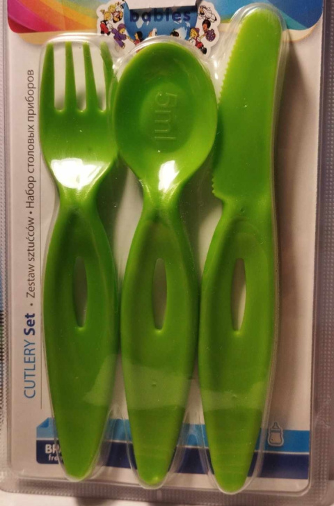 Zestaw bezpiecznych plastikowych sztućców dla maluszka od 1 roku życia. W zestawie: łyżka, widelec i nóż.