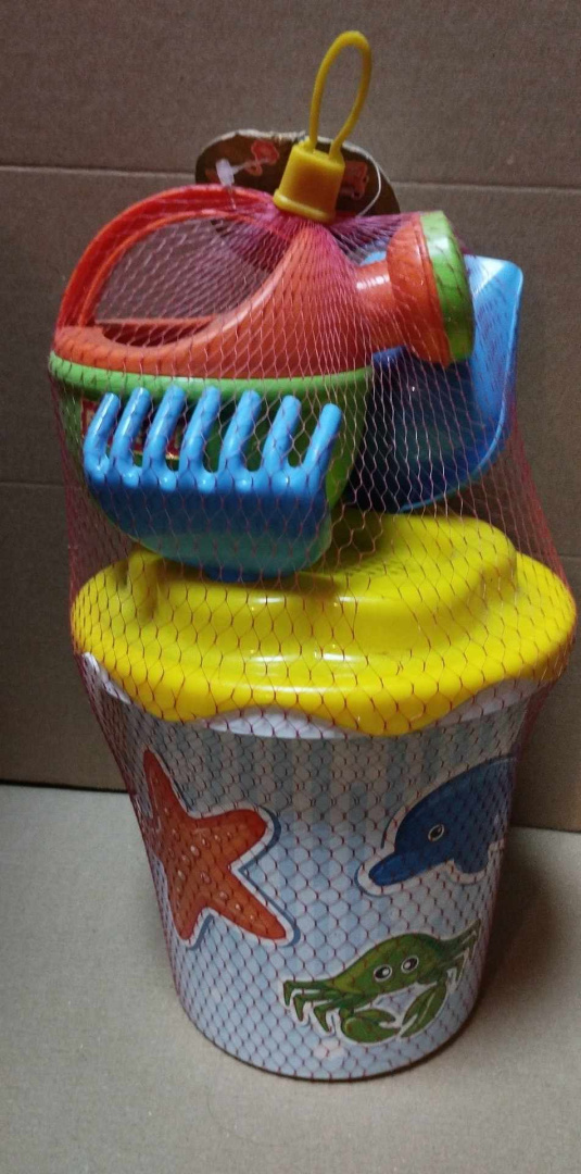 Zestaw do piasku - wiaderko z sitkiem 18cm, konewka 13cm, łapatki i grabki. Wykonane z dobrej jakości plastiku. Dla dzieci od 3 lat.