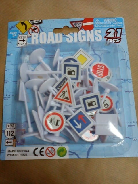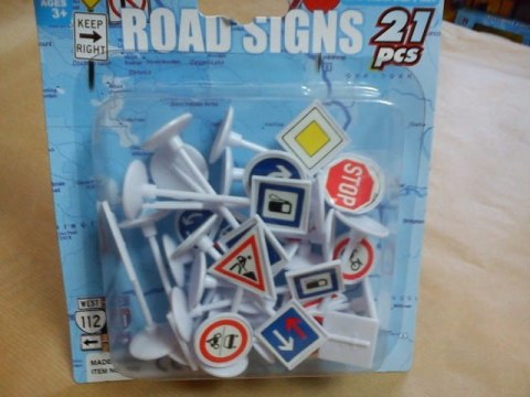 Zestaw 21 sztuk różnych znaków drogowych. Wysokość znaku 7cm. Świetnie nadają się do makiet, zabawy na matach samochodowych oraz do nauki i rozpoznawania znaków drogowych. Dla dzieci od lat 3.